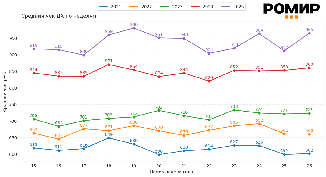 Диаграмма 1. Динамика недельного Индекса среднего чека, руб., 2021–2025 гг..