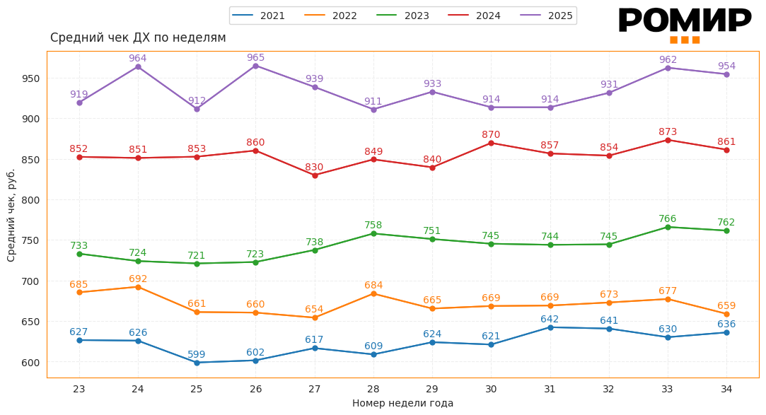 Диаграмма 1. Динамика недельного Индекса среднего чека, руб., 2021–2025 гг..