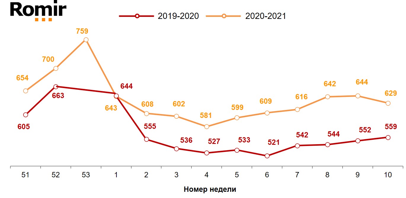 С 8 по 14 марта 2021 года Недельный чек (средняя стоимость одной покупки) сократился до уровня 629 рублей (см. График 1), что на 2,3% (15 рублей) меньше показателя предыдущей недели, и на 12,5% (70 рубля) больше размера недельного чека 10-й недели 2020 года.