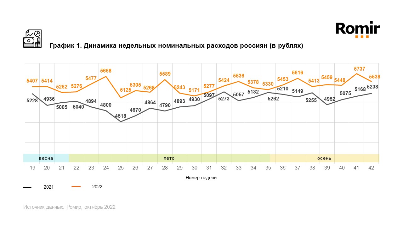 В период с 17 по 23 октября средние недельные расходы россиян сократились по сравнению с предшествующей неделей на 3,5%. Индекс недельных расходов составил 5538 рублей. В годовой динамике индекс вырос на 5,7%.