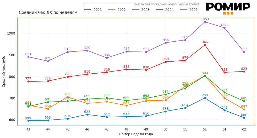 Диаграмма 1. Динамика недельного Индекса среднего чека, руб., 2021–2025 гг..