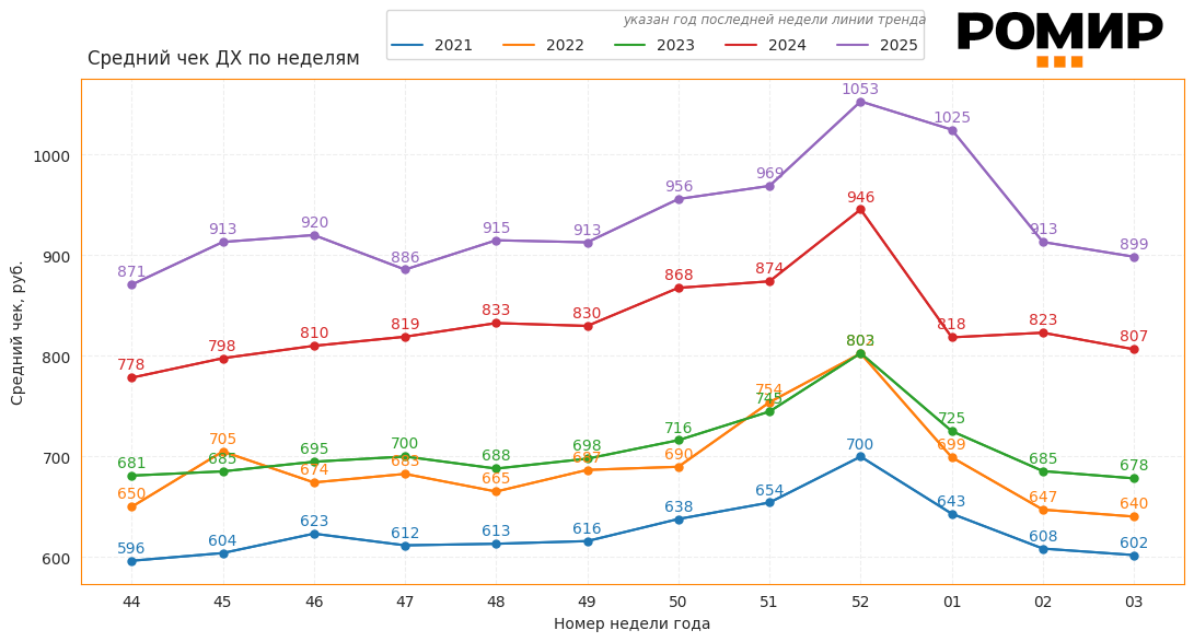 Диаграмма 1. Динамика недельного Индекса среднего чека, руб., 2021–2025 гг..