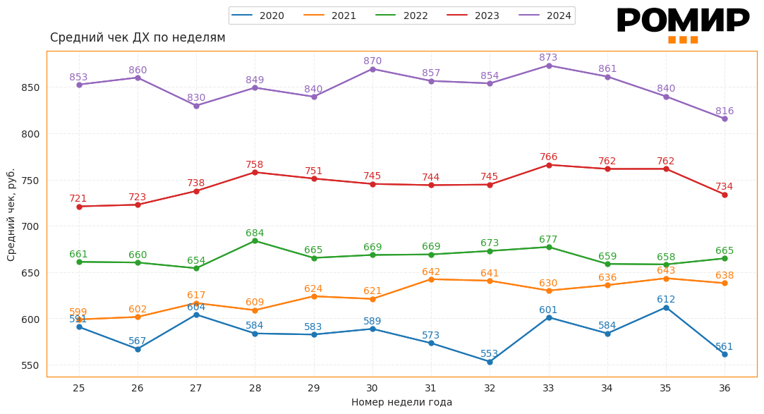 Диаграмма 1. Динамика недельного Индекса среднего чека, руб., 2020–2024 гг..