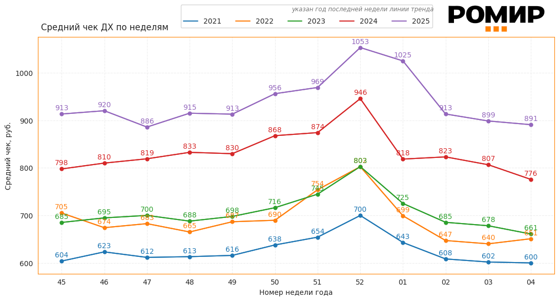 Диаграмма 1. Динамика недельного Индекса среднего чека, руб., 2021–2025 гг..