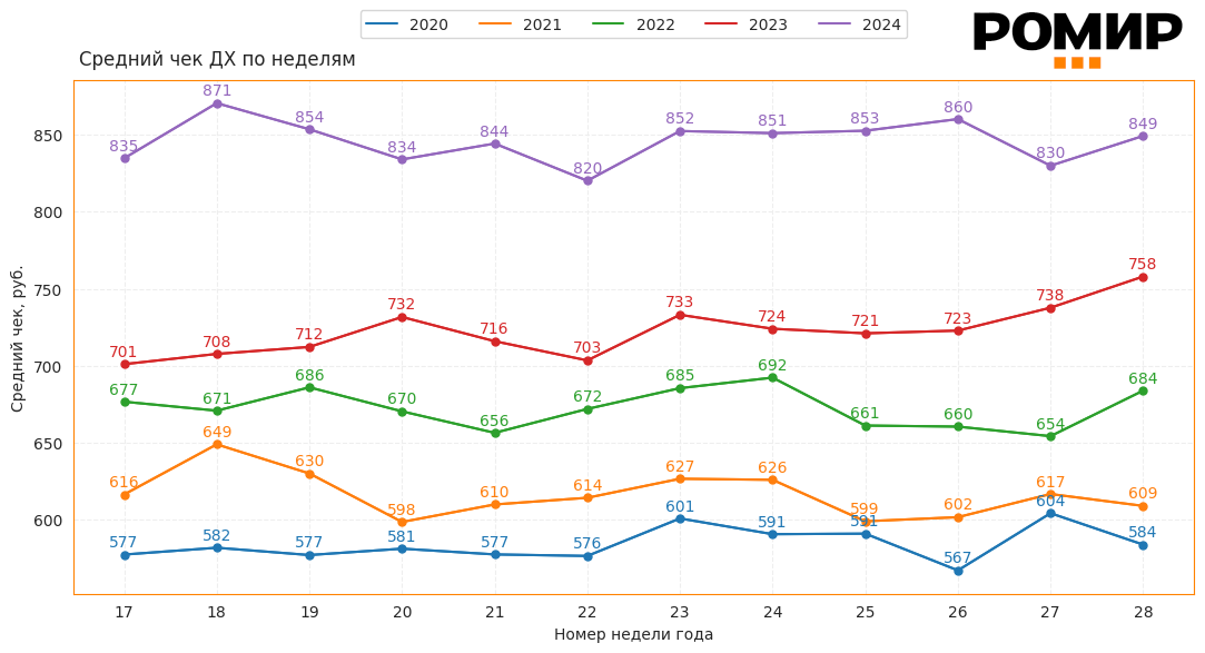 Диаграмма 1. Динамика недельного Индекса среднего чека, руб., 2020–2024 гг..