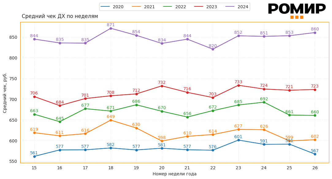 На прошедшей 26 неделе (с 24 по 30 июня) размер среднего чека на покупку товаров повседневного спроса составил 860 рублей, что на 7 рублей или 0,8% больше, чем неделей ранее. По сравнению с аналогичной неделей прошлого года размер среднего чека вырос на 137 рублей, прибавив тем самым 18,9%.