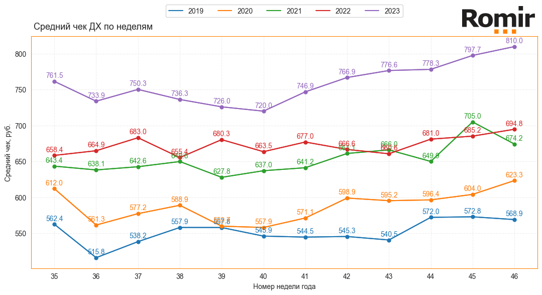 По сравнению с аналогичной неделей прошлого года чек вырос на 135.8 руб. или на 19%. В 2023 году недельный средний чек продолжает расти 6 недель под ряд. Если сравнивать, с аналогичным периодом 2022 года, когда на 45 неделе произошел скачок, а на 46 неделе значение снизилось, то в 2023 году мы наблюдаем последовательный рост все последние недели.