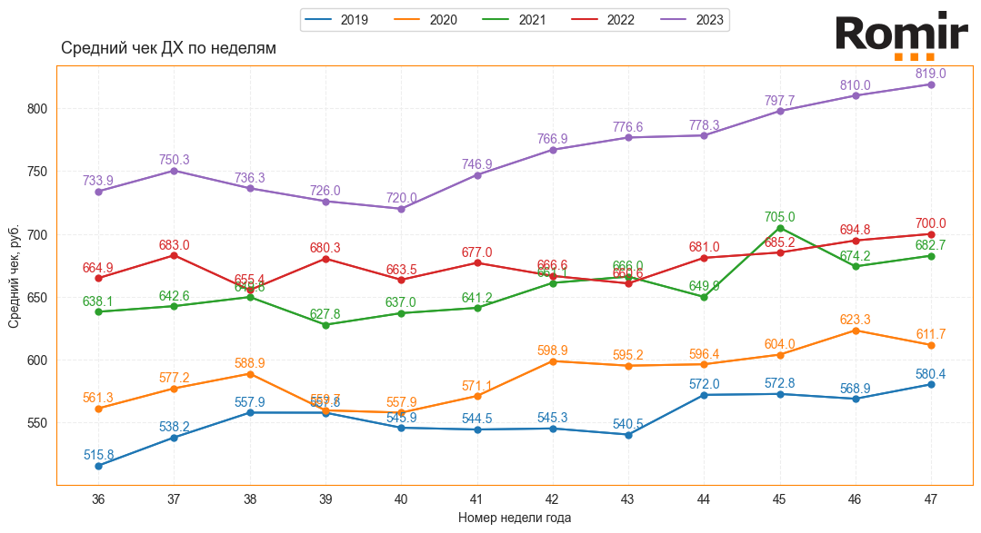819 рублей в среднем оставлял на кассе среднестатистический российский покупатель на прошедшей 47-й неделе (с 20 по 26 ноября 2023 года). Таким образом, средний чек за неделю прибавил 9 рублей или 1,1%. Тренд устойчивого роста среднего чека продолжается семь недель подряд.