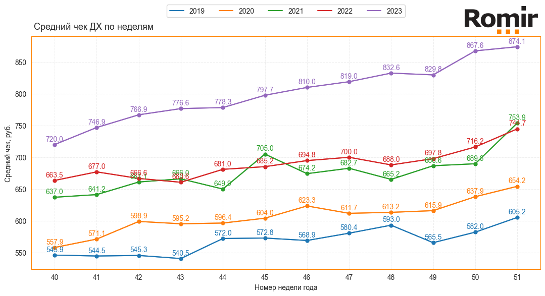 На прошедшей 51-й неделе (18-24 декабря) средний чек показал небольшой прирост относительно предыдущего периода. Динамика чека составила 6,5 руб. или 0,75%. Относительно аналогичной недели прошлого года средний чек увеличился на 129,4 руб. или на 17,4%.