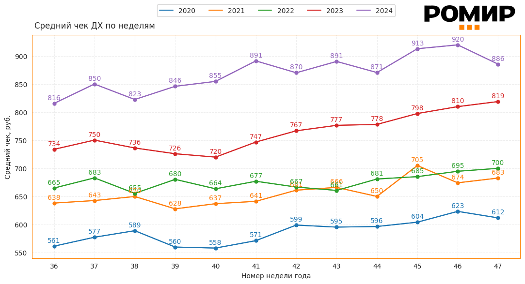 Диаграмма 1. Динамика недельного Индекса среднего чека, руб., 2020–2024 гг..