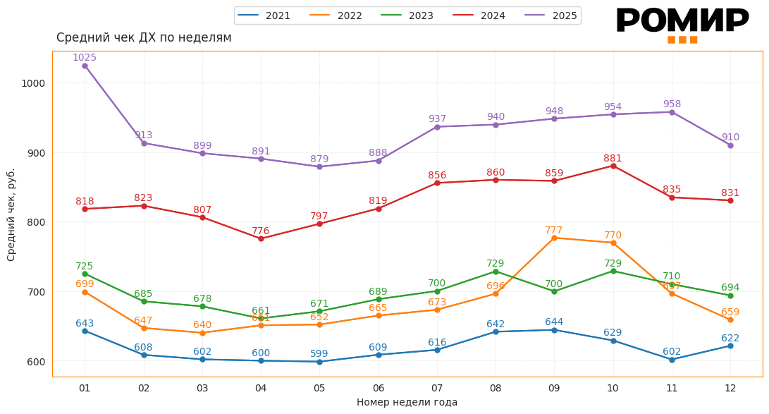 Диаграмма 1. Динамика недельного Индекса среднего чека, руб., 2021–2025 гг..