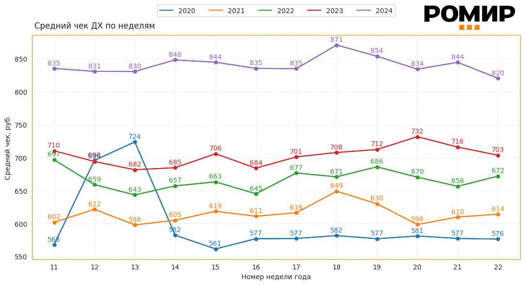 Диаграмма 1. Динамика недельного Индекса среднего чека, руб., 2020–2024 гг..