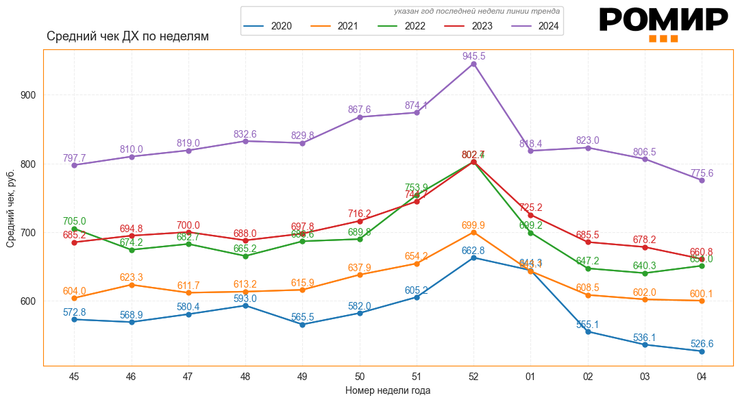 Диаграмма 1. Динамика недельного Индекса среднего чека, руб., 2020–2024 гг..