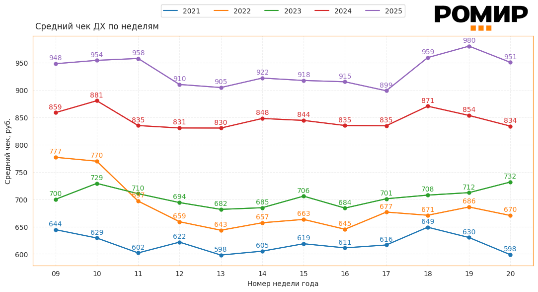 Диаграмма 1. Динамика недельного Индекса среднего чека, руб., 2021–2025 гг..