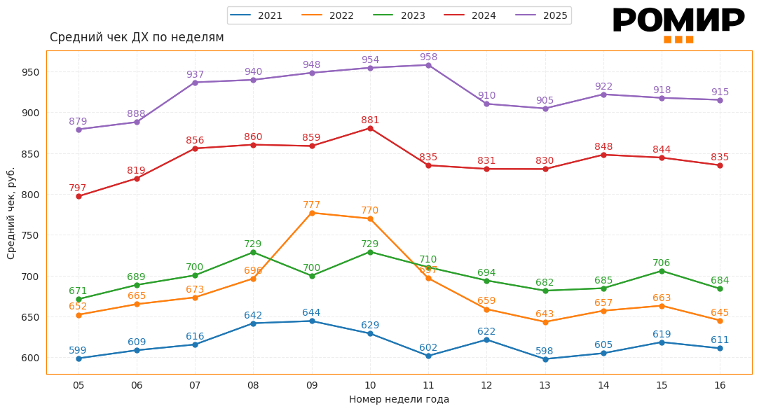 Диаграмма 1. Динамика недельного Индекса среднего чека, руб., 2021–2025 гг..