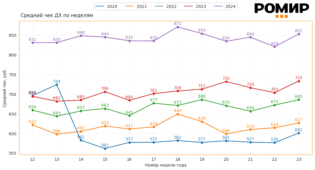 На прошедшей 23 неделе (с 2 по 8 июня) размер среднего чека на покупку товаров повседневного спроса составил 919 рублей, что на 18 рублей или 1.6% больше, чем неделей ранее. По сравнению с аналогичной неделей прошлого года размер среднего чека вырос на 67 рублей, прибавив тем самым 7.9%.