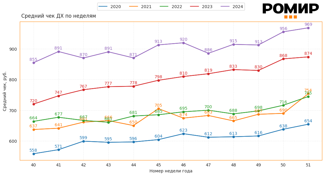 На прошедшей 51 неделе (с 16 по 22 декабря) размер среднего чека на покупку товаров повседневного спроса составил 969 рублей, что на 13 рублей или 1,3% больше, чем неделей ранее. По сравнению с аналогичной неделей прошлого года размер среднего чека вырос на 95 рублей, прибавив тем самым 10,9%.