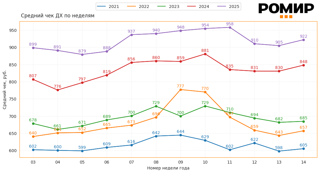 Диаграмма 1. Динамика недельного Индекса среднего чека, руб., 2021–2025 гг..