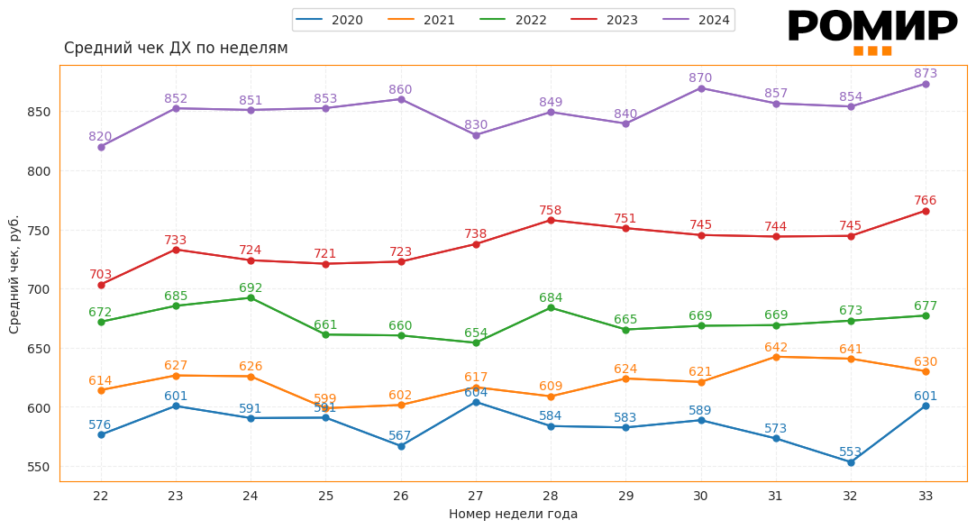На прошедшей 33 неделе (с 12 по 18 августа) размер среднего чека на покупку товаров повседневного спроса составил 873 рубля, что на 19 рублей или 2,2% больше, чем неделей ранее. По сравнению с аналогичной неделей прошлого года размер среднего чека вырос на 107 рублей, прибавив тем самым 14%.