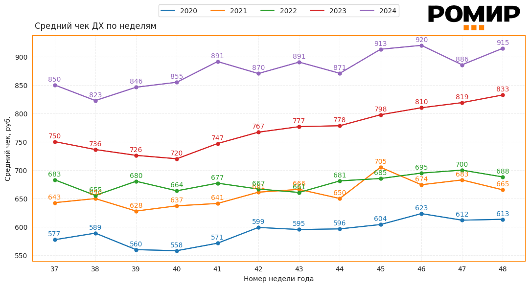 На прошедшей 48 неделе (с 25 ноября по 1 декабря) размер среднего чека на покупку товаров повседневного спроса составил 915 рублей, что на 29 рублей или 3,2% больше, чем неделей ранее. По сравнению с аналогичной неделей прошлого года размер среднего чека вырос на 82 рубля, прибавив тем самым 9.8%.