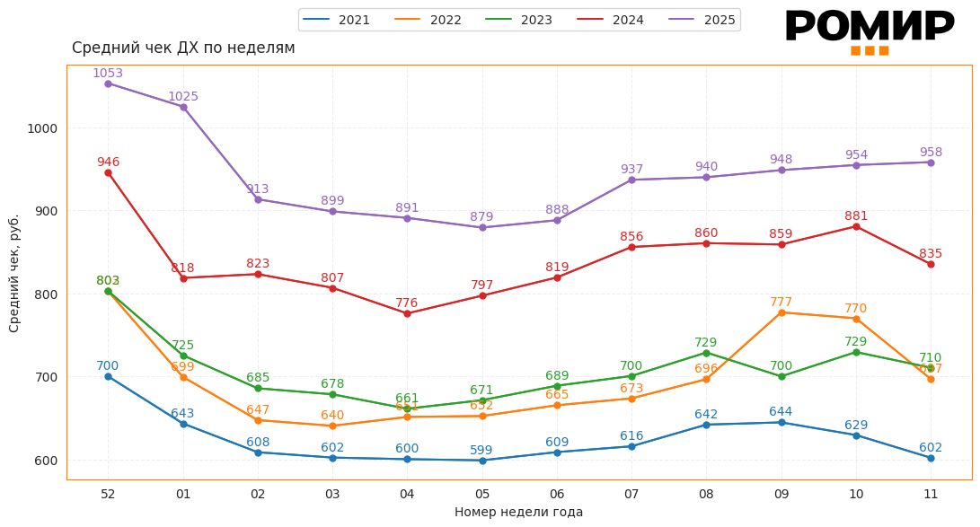 Диаграмма 1. Динамика недельного Индекса среднего чека, руб., 2021–2025 гг..