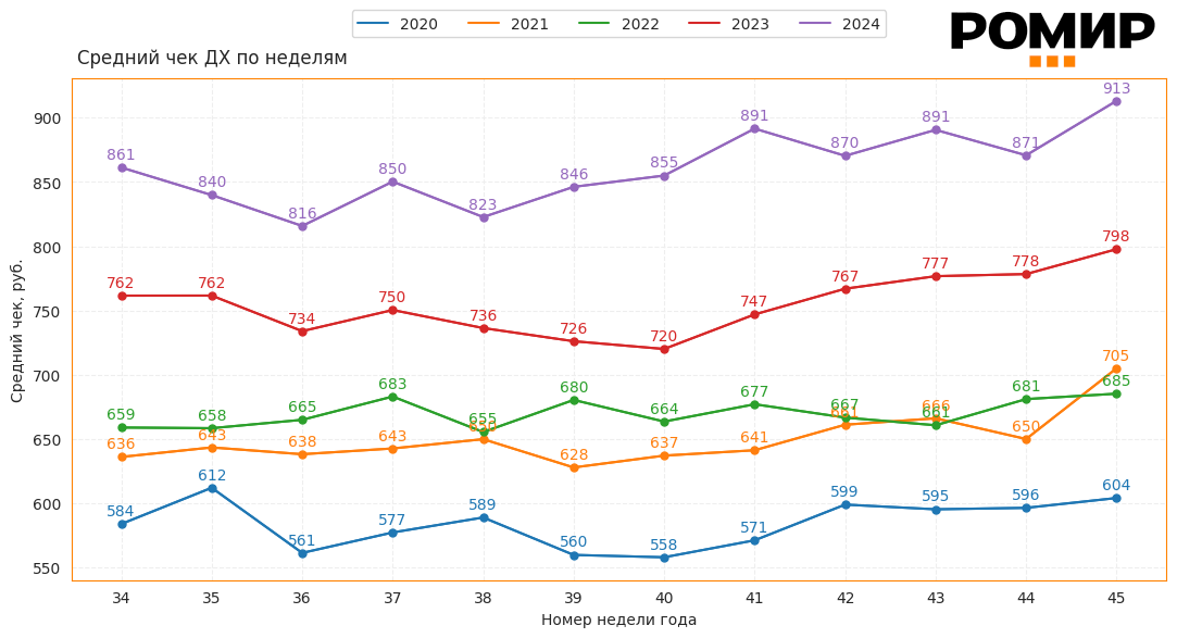 На прошедшей 45 неделе (с 4 по 10 ноября) размер среднего чека на покупку товаров повседневного спроса составил 913 рубль, что на 42 рубля или 4,6% больше, чем неделей ранее. По сравнению с аналогичной неделей прошлого года размер среднего чека вырос на 115 рублей, прибавив тем самым 14,4%.