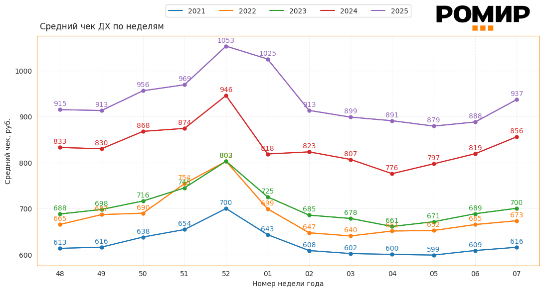 Диаграмма 1. Динамика недельного Индекса среднего чека, руб., 2021–2025 гг..