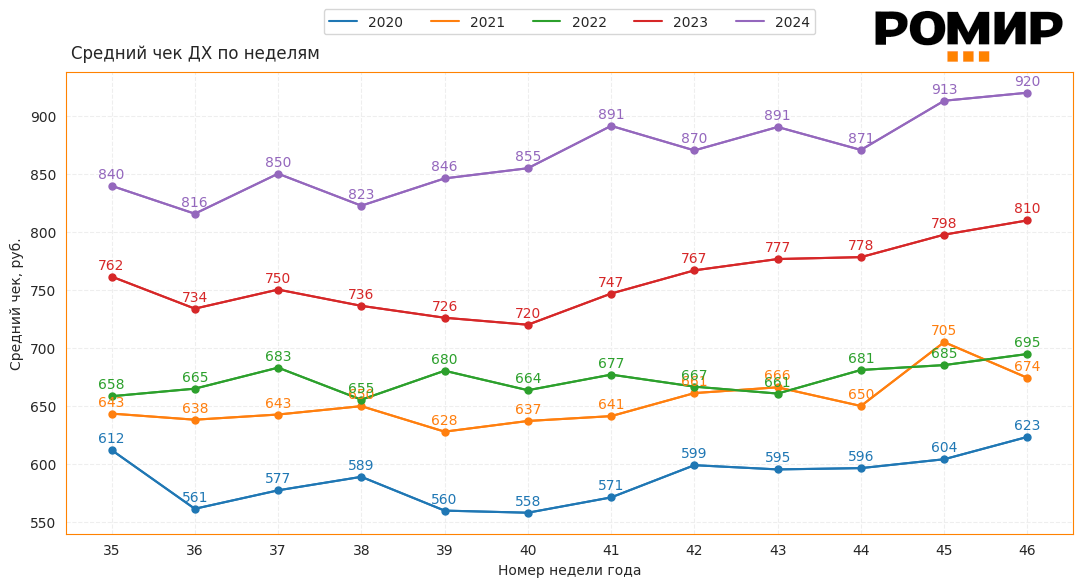 На прошедшей 46 неделе (с 11 по 17 ноября) размер среднего чека на покупку товаров повседневного спроса составил 920 рублей, что на 7 рублей или 0,8% больше, чем неделей ранее. По сравнению с аналогичной неделей прошлого года размер среднего чека вырос на 110 рублей, прибавив тем самым 13.6%.