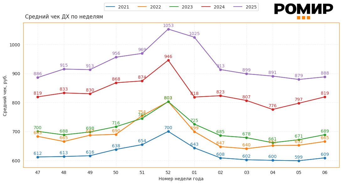 Диаграмма 1. Динамика недельного Индекса среднего чека, руб., 2021–2025 гг..