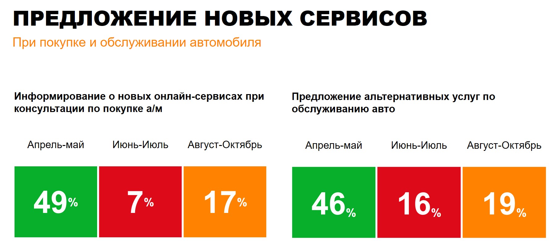 - В вопросе предложения альтернативных услуг по обслуживанию авто наблюдается схожая динамика: 46% в апреле-мае, 16% в июне-июле и 19% в августе-сентябре.