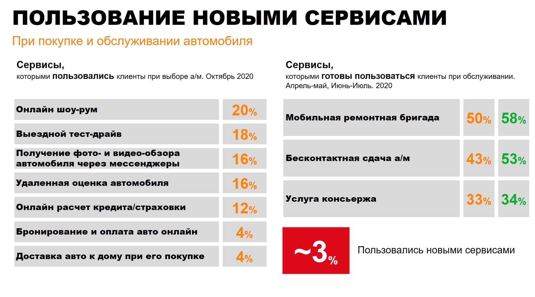 - Сервисами, которыми автомобилисты готовы воспользоваться, стали мобильная ремонтная бригада (58%), бесконтактная сдача автомобиля (53%) и услуги консьержа (34%).