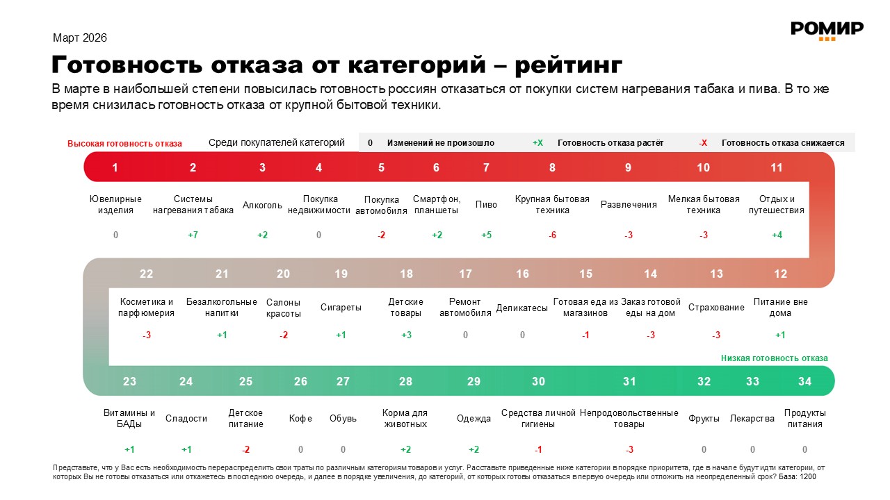 В структуре потребительских настроений россиян фиксируются изменения: готовность отказаться от отдельных категорий товаров продолжает перераспределяться под влиянием различных внешних и поведенческих факторов. Данные РОМИР показывают, какие категории теряют приоритет, а какие, напротив, сохраняют устойчивость в структуре расходов.
