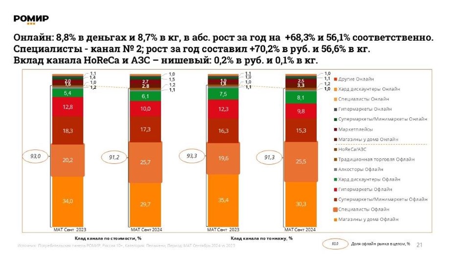 Исследование рынка пельменей, проведенное РОМИР, выявило интересные тенденции в потребительском поведении. Ранее было зафиксировано, что значительная доля расходов на данную категорию продуктов (каждый четвертый рубль) приходится на специализированные офлайн-магазины. Однако, более глубокий анализ показал значительную роль онлайн-канала сбыта, что соответствует общей тенденции роста онлайн-торговли в сегменте FMCG.