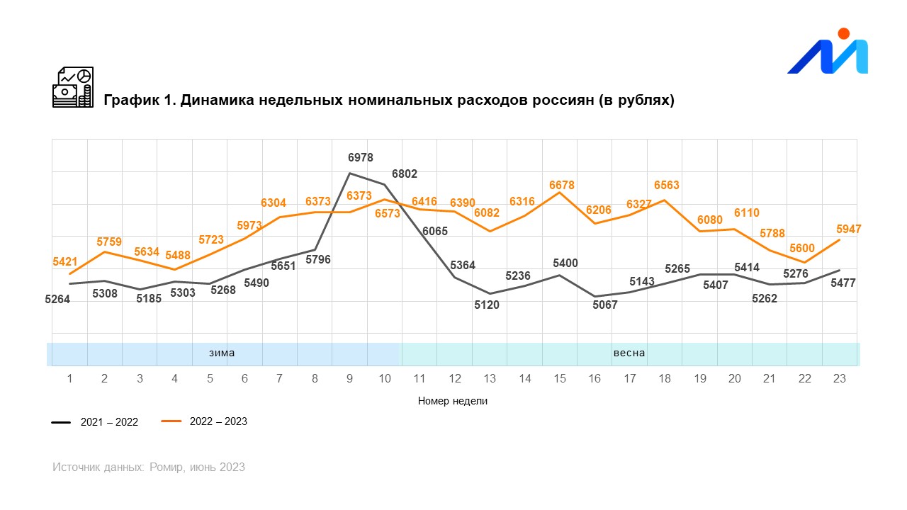 Так, на 23-й неделе года (с 5 мая по 11 июня) средние расходы россиян выросли на 6,2% в сравнении с 22-й неделей и составили 5947 рублей. Годовой рост средних расходов составил 8,6%.