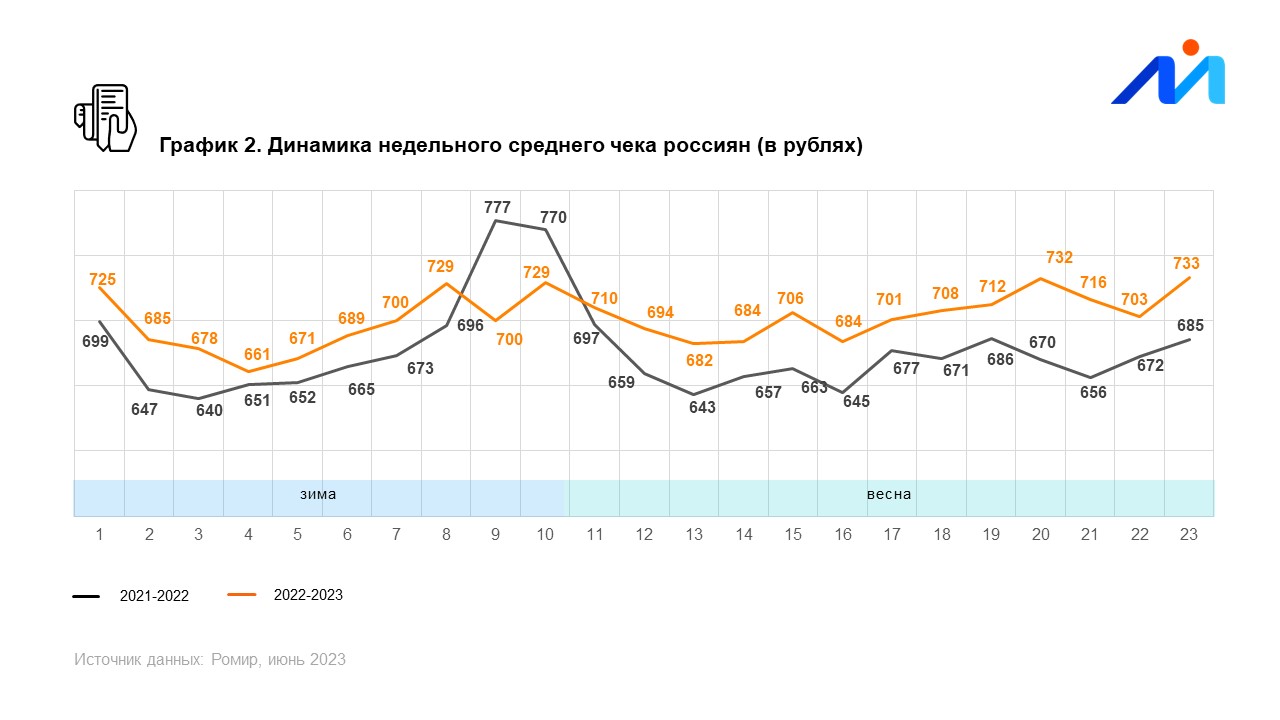 Индекс среднего чека на 23-й неделе составил 733 рубля, что на 4,2% больше, чем на предыдущей неделе, и на 7% больше в годовом измерении.