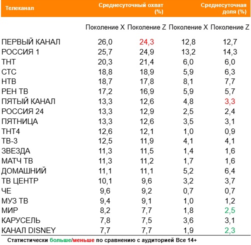 По итогам исследования на прошлой неделе представители молодежи возрастом до 21 года реже смотрели «Первый канал» (24,3%), чем россияне 35-55 лет (26%). Разница в охвате других телеканалов по этим категориям оказалась незначительной. Зато популярнее среди телезрителей из «Поколения Z» оказались телеканалы «МИР» и «Disney». Их среднесуточная доля в этой категории составила 2,5% и 2,3% соответственно.