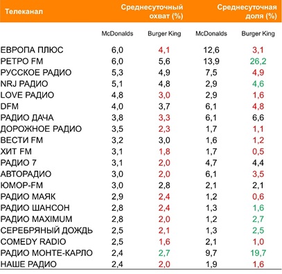 Покупатели Burger King по сравнению с покупателями McDonald’s на прошлой неделе меньше по времени слушали почти все радиостанции. Исключение составили «Ретро FM» (13,9% - McD, 26,2% - BK), «Радио Монте-Карло» (9,7% - McD, 19,7% - BK), а также «NRJ Радио», «Радио Шансон», «Радио Maximum» и «Серебряный дождь» - их слушали больше.
