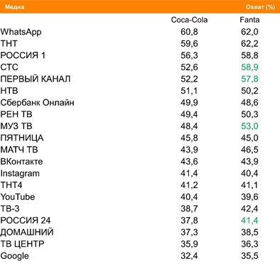 На прошлой неделе любители Fanta чаще любителей Coca-Cola смотрели телеканалы «СТС», «Первый канал», «МУЗ ТВ» и «Россия 24».