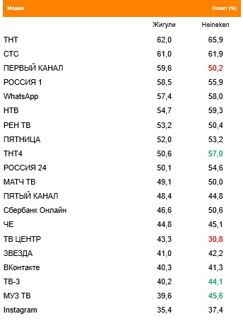 На прошлой неделе покупатели Heineken чаще покупателей «Жигули» смотрели телеканалы ТНТ4 (57%, на 6,4 п.п. больше), МУЗ-ТВ (45,6%, на 6 п.п. больше) и ТВ-3 (44,1%, на 3,9 п.п. больше).