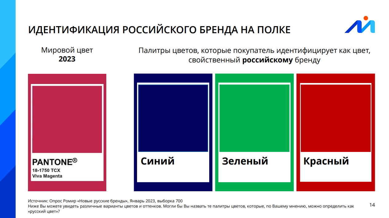 Покупатели выступают за развитие отечественного производства и русифицированную коммуникацию. Согласно исследованию, новый бренд отечественного производителя с российскими характеристиками (название, логотип, дизайн) предпочитают 73% потребителей, в то время как бренд с иностранными характеристиками — 27%.