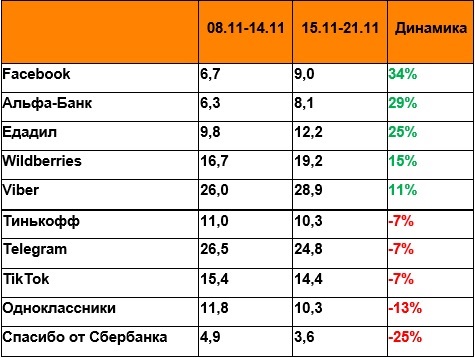 Далее в пятерке лидеров расположились: приложение Альфабанка (+29%), Едадил (+25%), маркетплейс Wildberries (+15%) и мессенджер Viber (+11%).