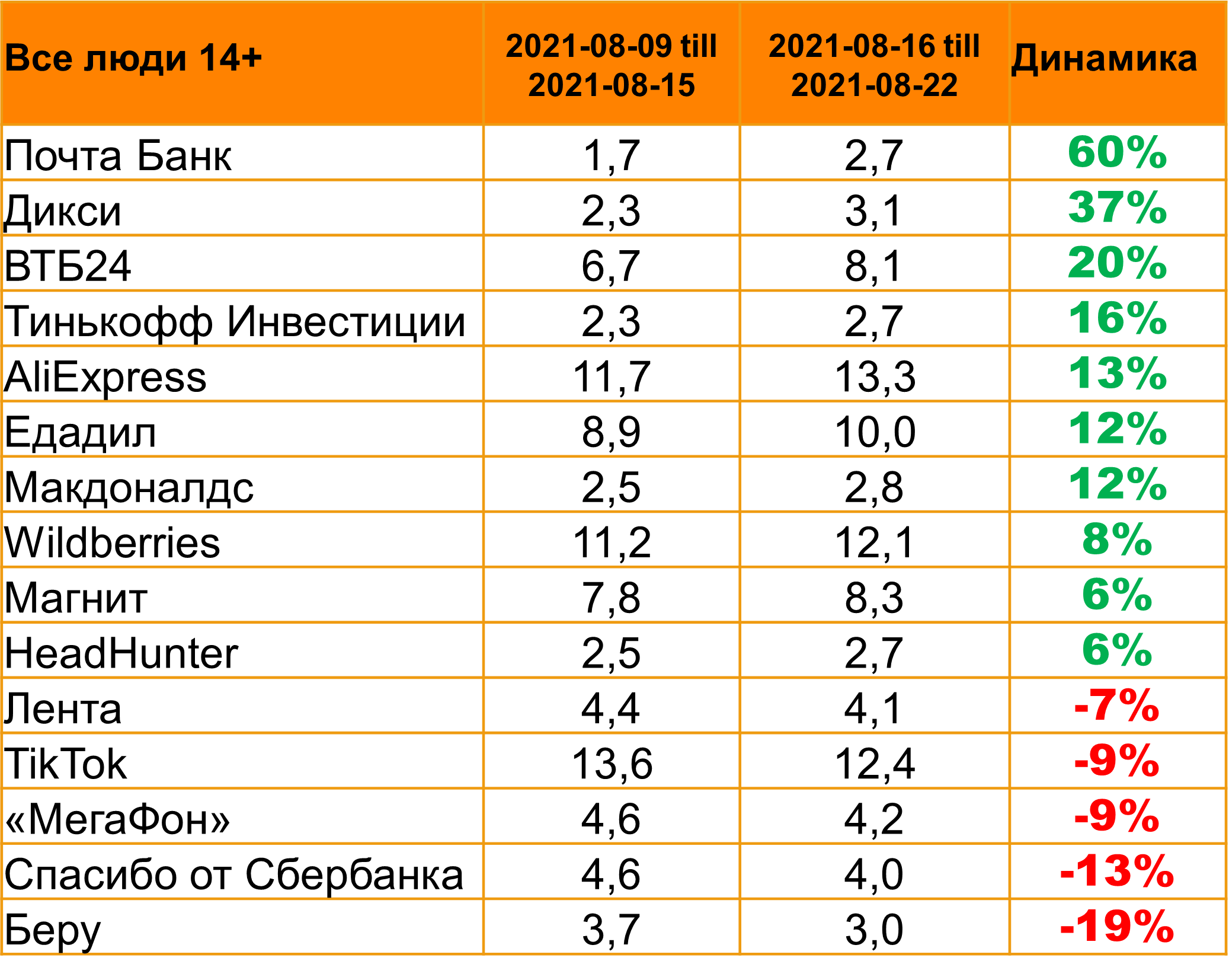 Мы выяснили, что в период с 16 по 22 августа 2021 года самый большой прирост по доле пользователей (охвату) среди массовых приложений продемонстрировали «Почта Банк» (+60%), «Дикси» (+37%) и «ВТБ24» (+20%). Число пользователей за неделю снизилось у приложений «Беру» (-19%), «Спасибо от Сбербанка» (-13%), а также у TikTok и Мегафона (-9%).