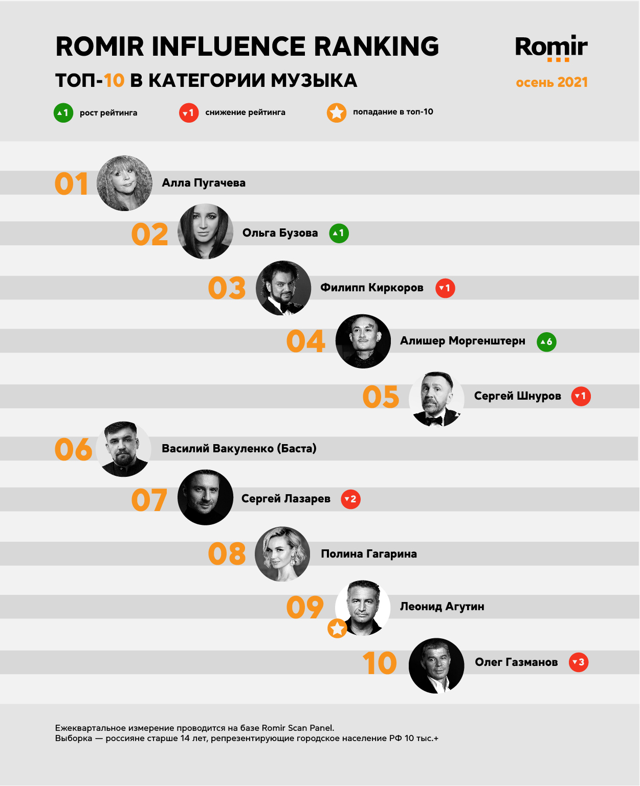 Исследовательский холдинг Ромир в рамках ежеквартального рейтинга доверия представляет топ-10 инфлюенсеров среди музыкальных исполнителей. Возглавляет этот рейтинг по-прежнему Алла Пугачева.