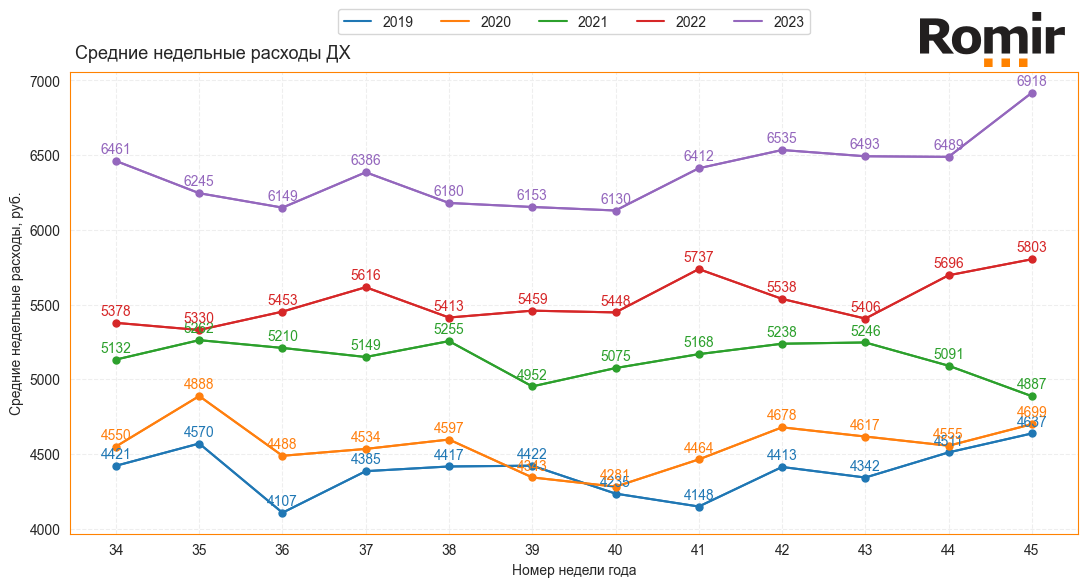 На прошедшей 45-й неделе 2023 года (с 6 по 12 ноября) общие расходы среднестатистического российского домохозяйства на еду и товары повседневного спроса составили 6918 руб., прибавив 429 руб. к показателю предыдущей недели. Таким образом, согласно Единой панели данных Ромир, Индекс недельных расходов (ИНР) по результатам недели достиг отметки в 236,7%, увеличившись на 6,6% относительно предыдущего периода. По сравнению с аналогичной неделей 2022 года объем недельных расходов вырос на 1115 рублей или на 19,2%.