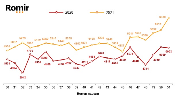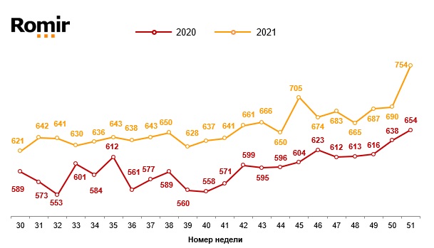 Недельные номинальные расходы россиян (в рублях). Недели 30–51, 2020–2021 гг.