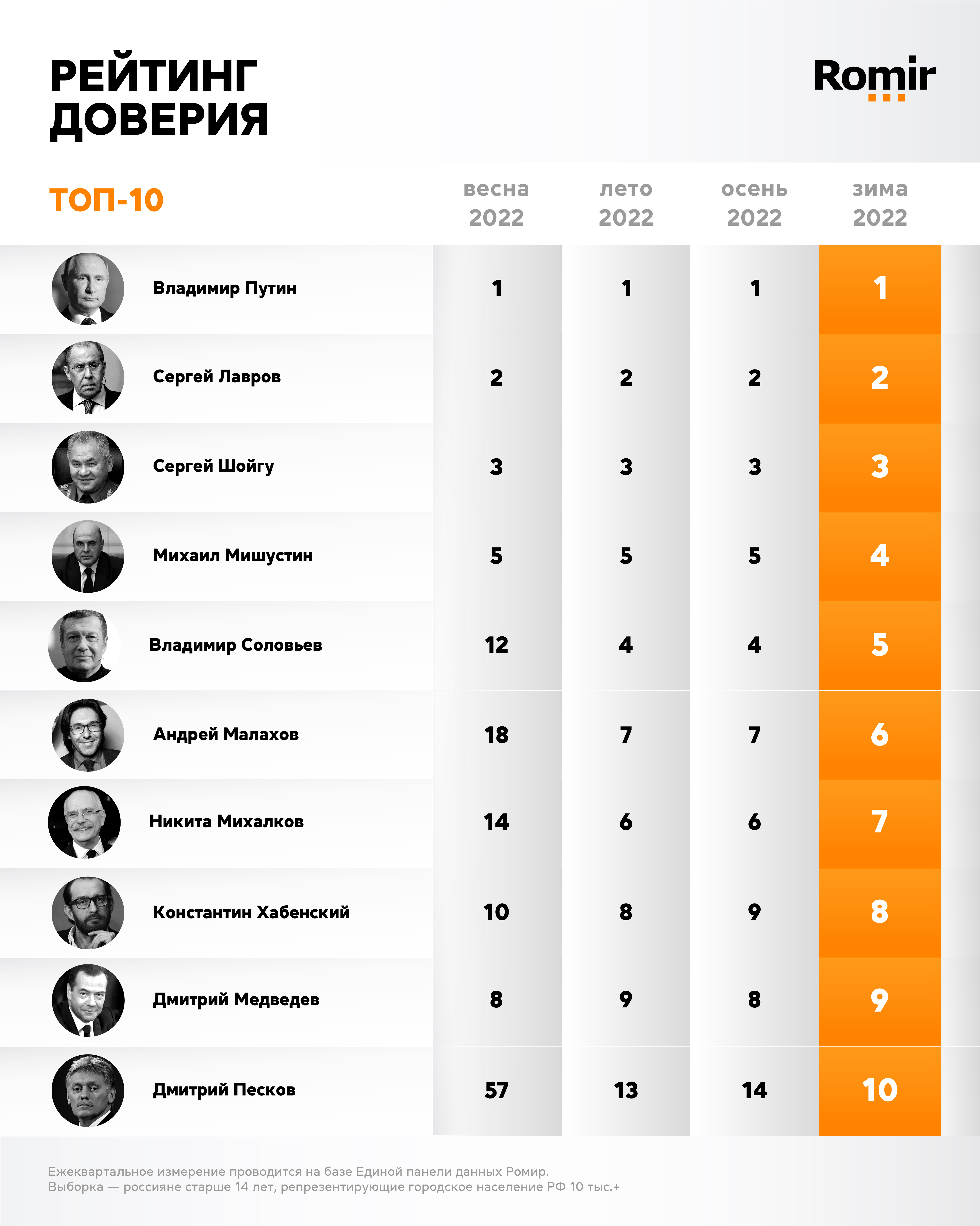Поднялся на 4 место Председатель Правительства РФ Михаил Мишустин, сместив на 5 строчку телеведущего Владимира Соловьева. Поменялись местами в зимнем рейтинге телеведущий Андрей Малахов и режиссер Никита Михалков (6 и 7 места соответственно). Снова вернулся на 8 место актёр Константин Хабенский. На 9 строчке расположился Первый заместитель председателя Военно-промышленной комиссии РФ Дмитрий Медведев. Замыкает десятку лидеров зимнего рейтинга доверия и впервые за год в топе пресс-секретарь Президента РФ Дмитрий Песков.