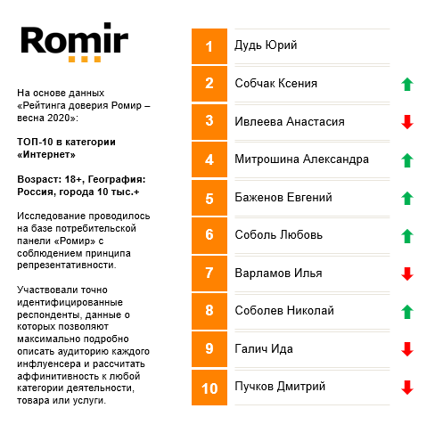 Исследовательский холдинг «Ромир» представляет ТОП-10 интернет-деятелей на основе данных «Рейтинга доверия Ромир – весна 2020»*.