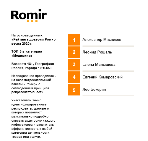 Исследовательский холдинг «Ромир» представляет ТОП-5 врачей на основе данных «Рейтинга доверия Ромир – весна 2020»*.