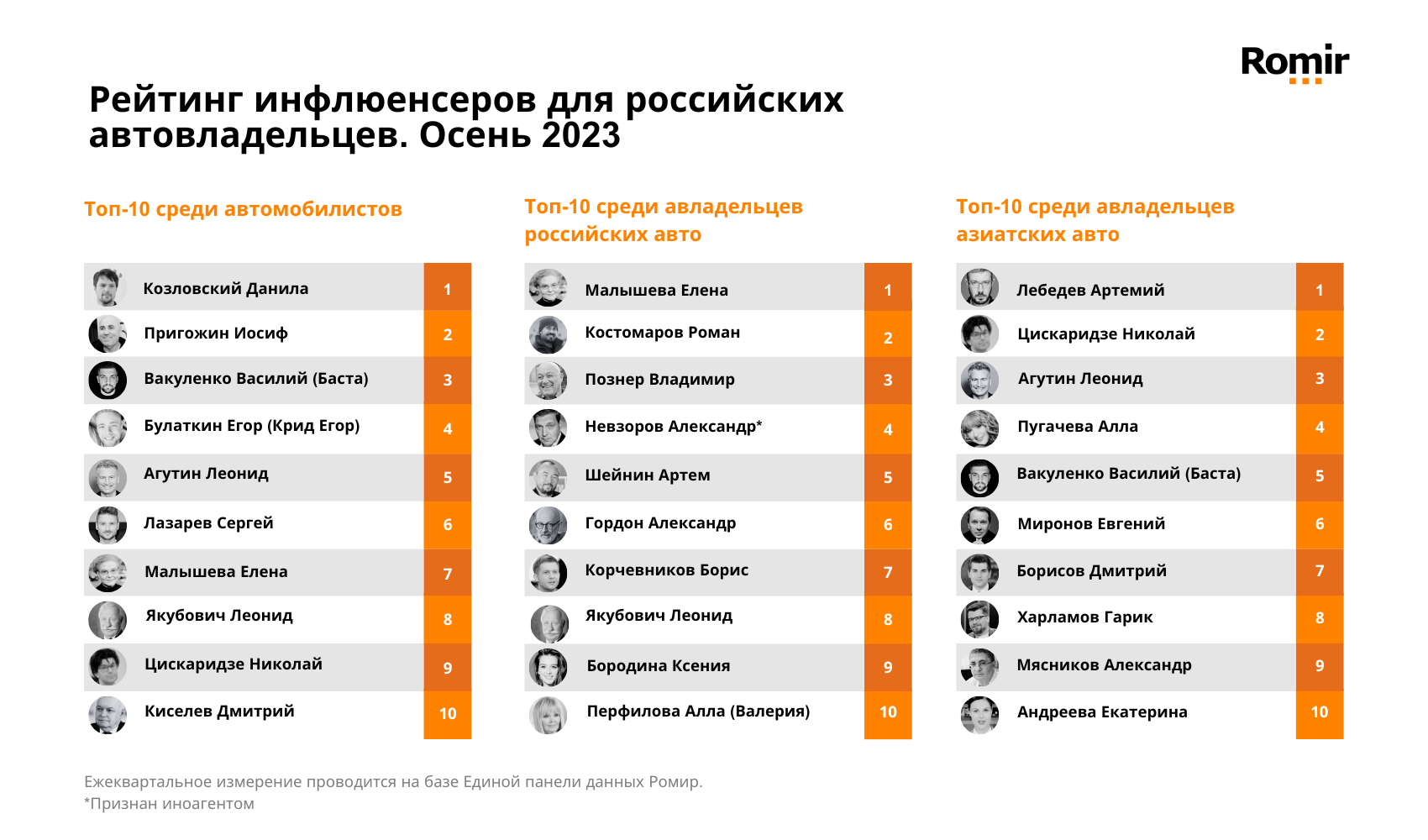 Исследовательский холдинг Ромир впервые публикует аффинитивный индекс для российских автовладельцев – кому из публичных персон доверяют отечественные водители. Абсолютным лидером мнений в целевой группе был назван Данила Козловский. Десятку инфлюенсеров среди владельцев отечественных авто возглавила Елена Малышева, а Артемий Лебедев наиболее популярен среди владельцев авто азиатских марок.