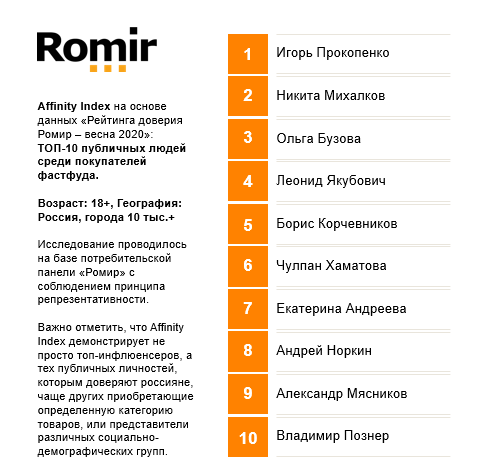 Исследовательский холдинг «Ромир» представляет Рейтинг инфлюенсеров на основе данных «Рейтинга доверия Ромир – весна 2020»*: ТОП-10 публичных людей среди покупателей фастфуда. Важно отметить, что данный рейтинг на основе Affinity Index демонстрирует не просто топ-инфлюенсеров, а тех публичных личностей, которым доверяют россияне, чаще других приобретающие определенную категорию товаров, или представители различных социально-демографических групп.
